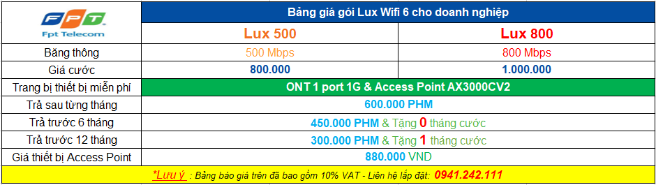 Sau đây là bảng báo giá lắp đặt các gói dịch vụ của FPT :