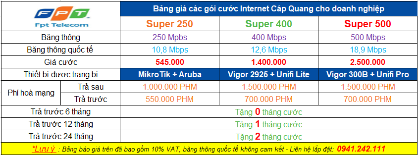 Các gói cước Internet cáp quang dành cho doanh nghiệp chủ yếu khác nhau về tốc độ đường truyền trong nước, tốc độ đường truyền quốc tế và trang thiết bị đầu cuối dành riêng cho từng gói cước.