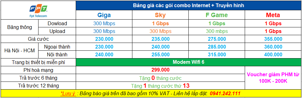 Bảng báo giá gói cước combo FPT dành cho hộ gia đình